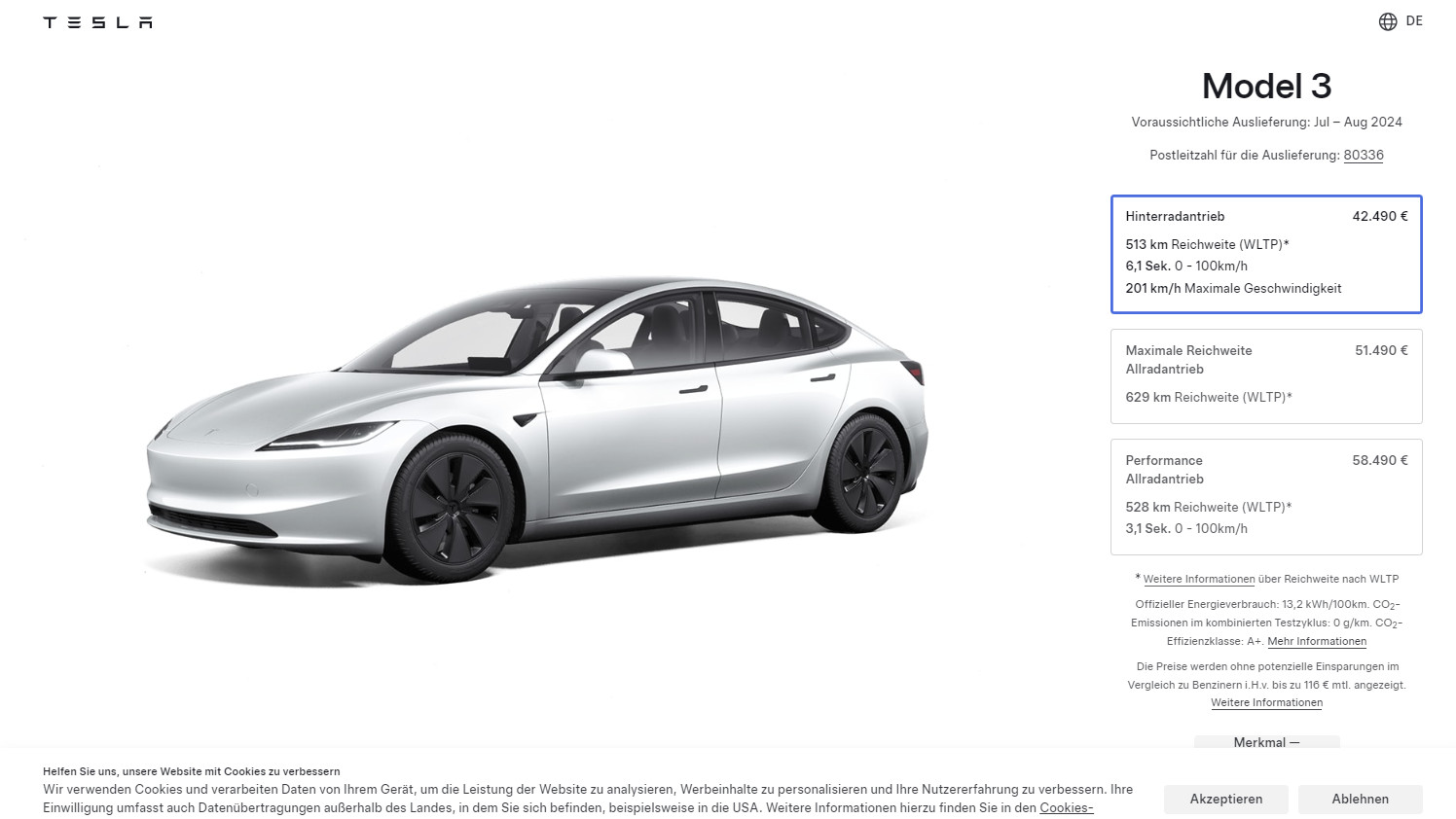 Im selben Maße steigen auch die Preise für die beiden anderen Versionen, den neuen Hecktriebler mit großer Reichweite und die Performance-Variante, die seit April bestellbar ist. Hier die drei Versionen in der Übersicht: