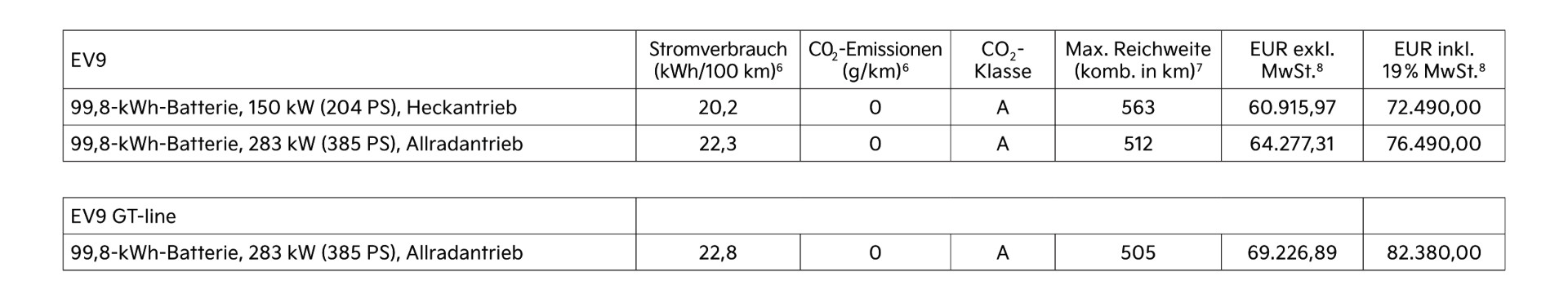 | Kia EV9 76 kWh RWD | Kia EV9 100 kWh RWD | Kia EV9 100 kWh AWD | Kia EV9 GT | |