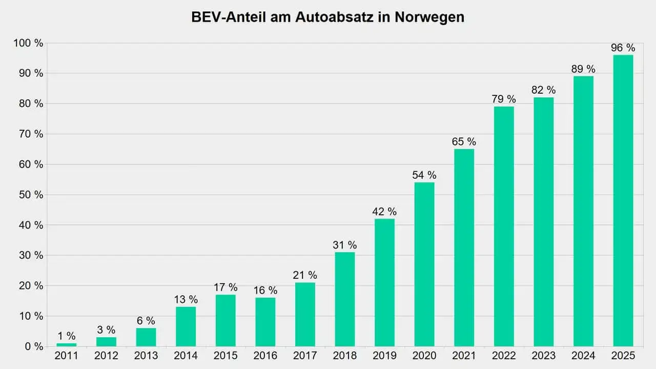 Norwegen hat die Umstellung auf die Elektromobilität fast schon hinter sich, zumindest wenn man sich den Neuwagenmarkt ansieht: Im Jahr 2025 entfielen 95,9 Prozent davon auf batterieelektrische Fahrzeuge (BEVs).