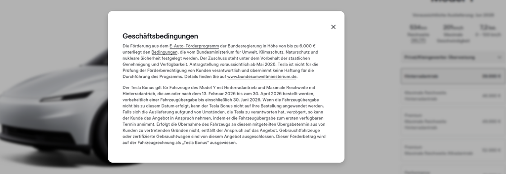 Die beiden Modelle heißen offiziell Model Y Hinterradantrieb und Model Y Maximale Reichweite Hinterradantrieb. Der Rabatt gilt für alle Kundinnen und Kunden – egal, ob man die Voraussetzung für die staatliche Förderung erfüllt oder nicht. Der Rabatt ist auch unabhängig davon, ob man das Auto kaufen, leasen oder finanzieren möchte.